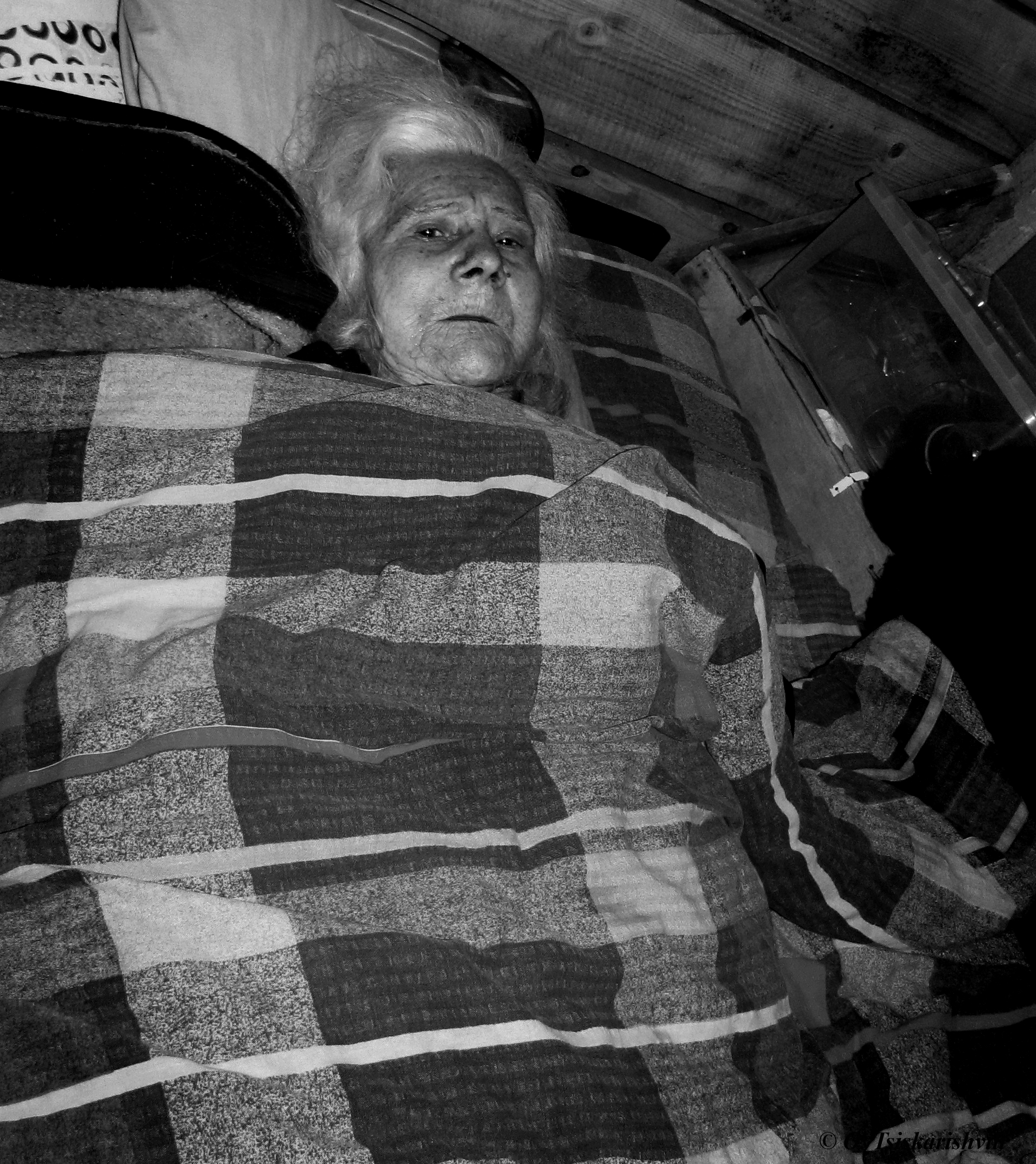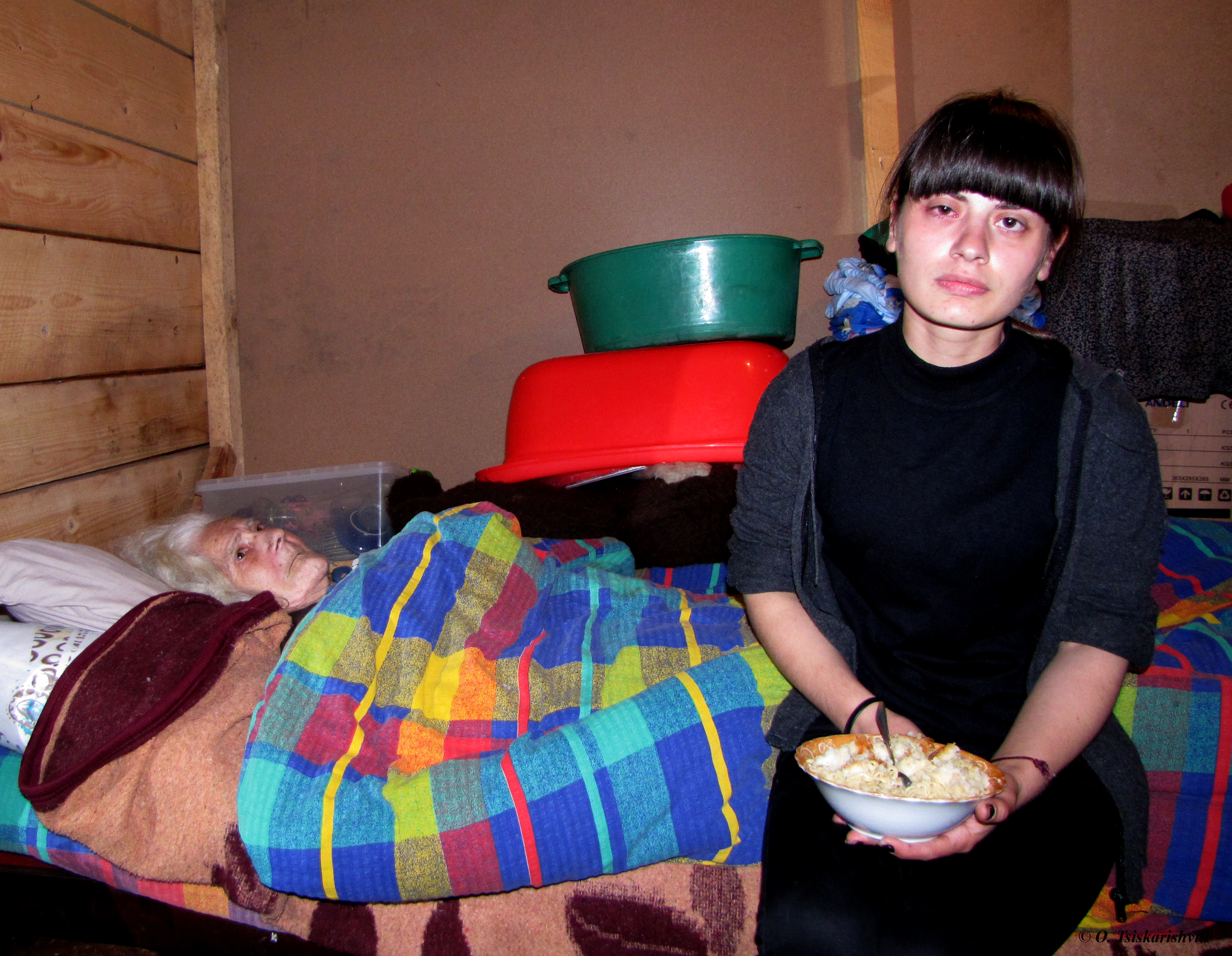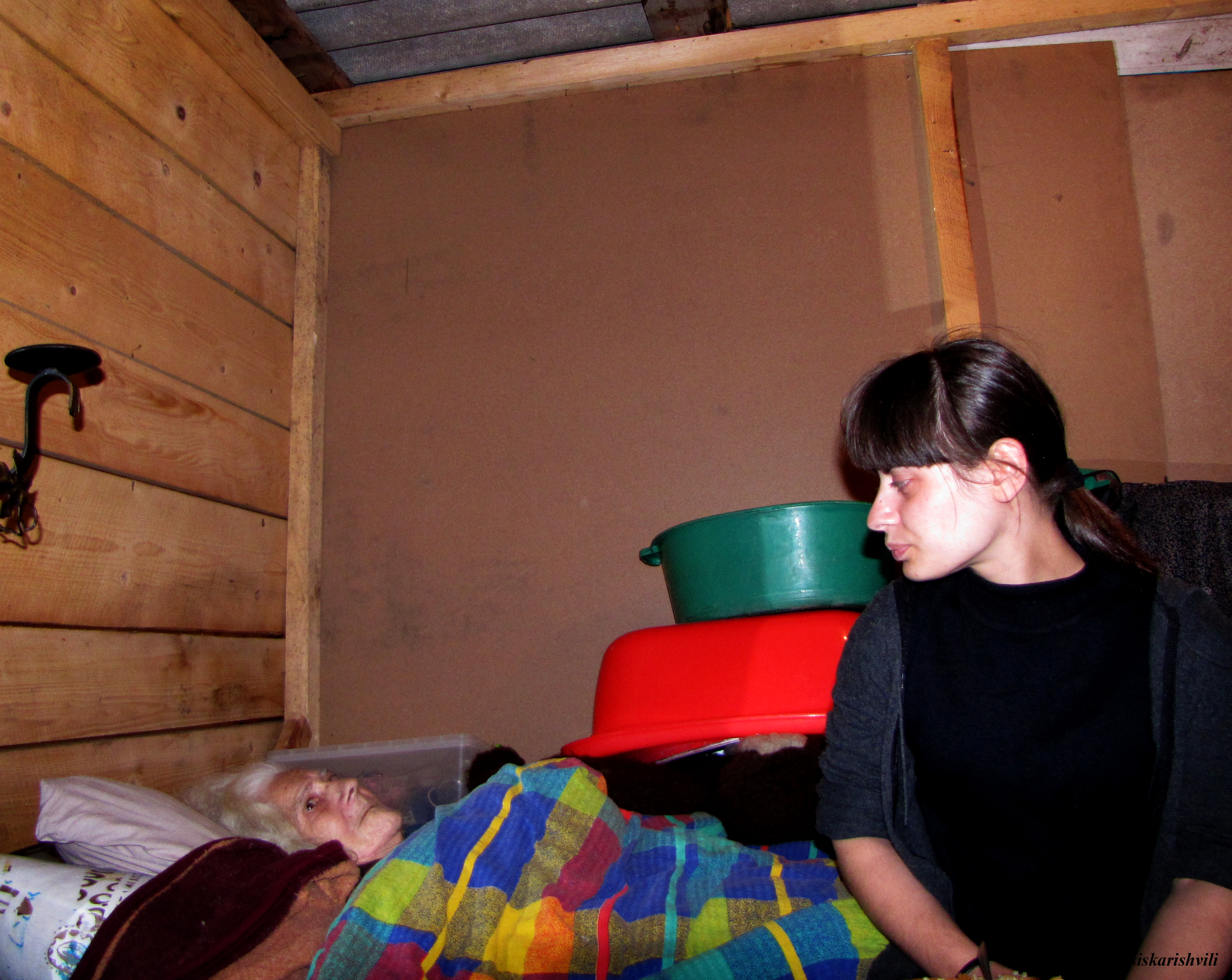 “ბათუმელები ვართ, 90-იან წლებში გავყიდეთ, მერე მდგურად ვცხოვრიობდით, ეხლა აქ ვცხოვრობთ, – მეუბნება დას ქოხში მიმიძღვის, იქ მისი ბებო წევს, – ეს ბებოა ჩემი, – მაცნობს, უკვე წლებია მწოლიარეს უვლის, საჭმელს ხელით აჭმევს, – ბებოს ინსულტი სამჯერ აქვს გადატანილი. მთელი ზამთარი ასეთ მდგომარეოაბში გაატარა ბებომ, – გვიყვება 23 წლის მაისურაძე როზეტა, – ბინის ქირას ძლივს ვიხდიდით და ბებია გახდა ავად. საკვების ფული არ გვქონდა, ინსულტიანი ბებო, შიმშილით გვიკვდებოდა, ჩვენც სასადილოში ვიყავით ჩაწერილი, და ჩვენი წილი მასთან მოგვწონდა. მერე კი, აქ მოვედით, აქ ვცხოვრობთ 2013 წლიდან.”