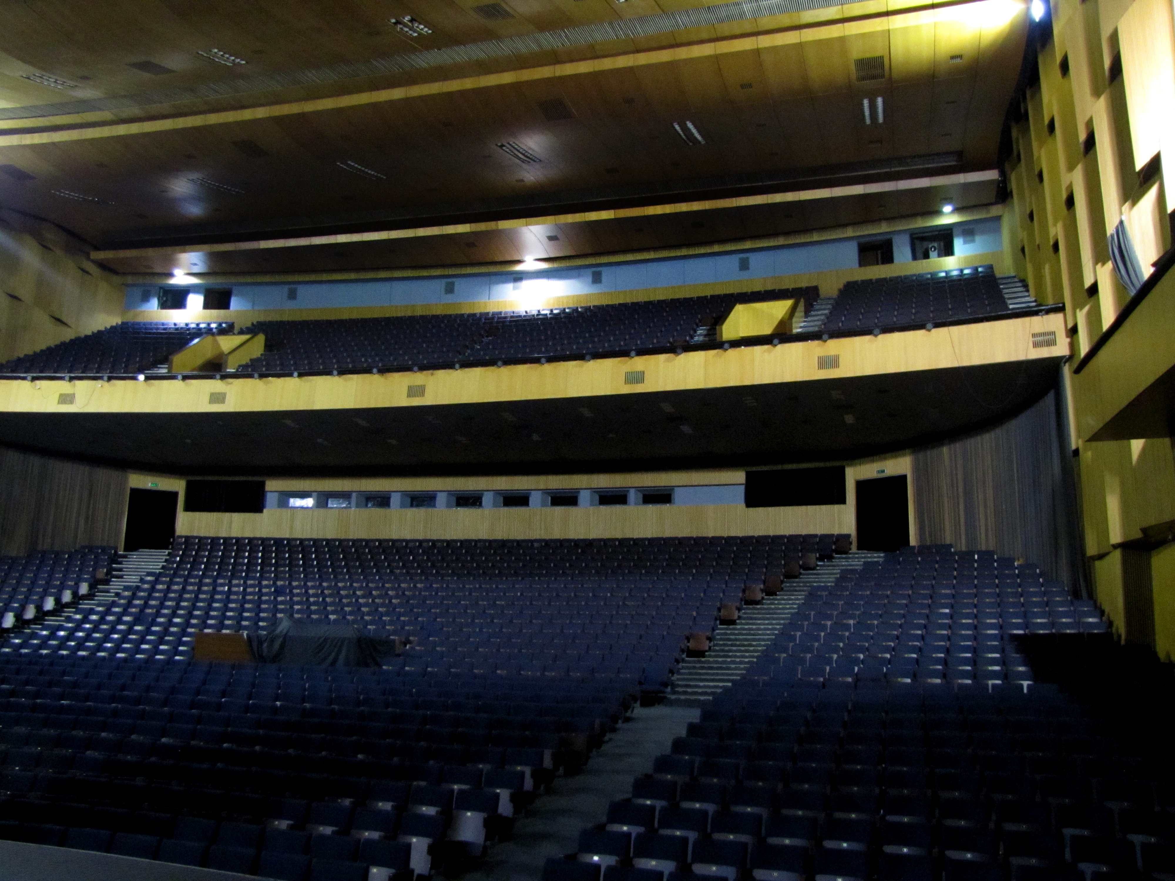 თავიდან, პანორამული კინოს მშენებლობა იგეგმებოდა და დაბრაზი 2 300 კაცზე იყო განსაზღვრული. ადრე, დარბაზი, ყრილობების დარბაზად იწოდებოდა. აკუსტიკურად კარგად შეკრული დარბაზი ერთ-ერთი იყო სსრ კავშირის მასშტაბით, რომელშიც ხმა გამაძლიერებლის გარეშე ისმოდა მთელ დარბაზში. შენობა, რომელიც მოიაზრებოდა პანორამულ კინოდ და ჰქონდა უზარმაზარი ეკრანი, მოგვიანებით, დარბაზად გადაკეთდა.